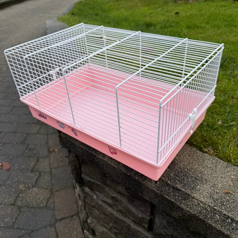 Buret fungerer fint slik det er. Noen av hylleplatene (spesielt nederste hyllen) er gnaget på og har hull ned til gitteret, men dette har vi enkelt løst med matter over. Eventuelt kan man bestille nye hylleplater fra ulike leverandører. Vi har selv brukt det slik i mange år uten problemer.