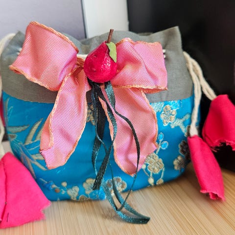 Selger en vakker grønn stoffpose med utsøkt hullmønster og små speil som gir et bohemsk preg. Snor-lukking med fargerike detaljer og skjell i endene gjør den både praktisk og dekorativ. Perfekt som gavepose, til å oppbevare smykker, tarotkort, småting eller bare som en stilig accessory.