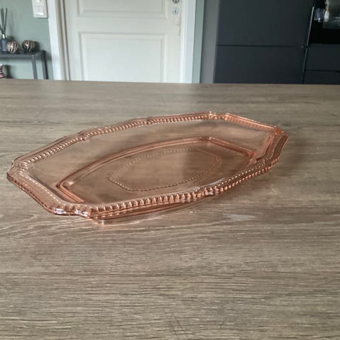 Rosa eldre glassfat selges. Diameter 28 cm.