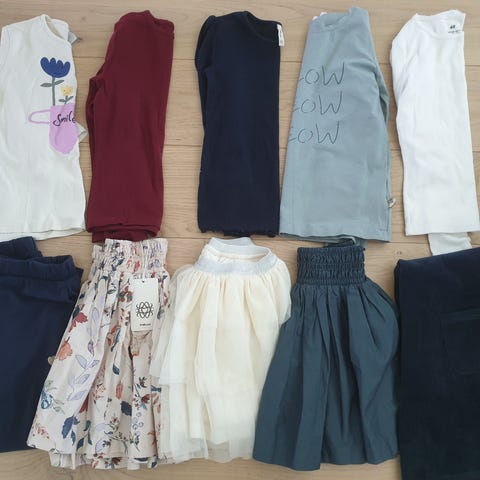 Klassisk klespakke for jente ca 12 år. Blondebluse og tyllskjørt fra Benetton og flerfarget foldeskjørt med topp fra American outfitters. Toppen har glitter og metallisk tekst foran. Kan brukes til hverdags eller spesielle anledninger. Passer for jenter som ønsker komfortable og stilige klær.