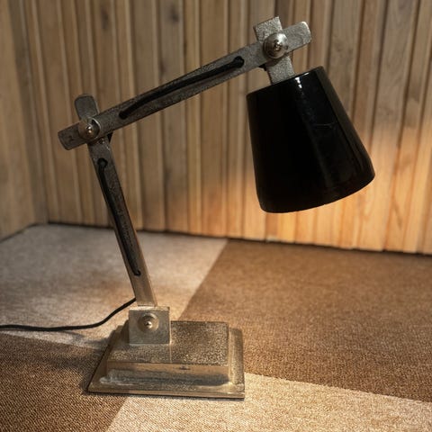 Lampen er i god fungerende stand, men har en del bruksmerker og slitasje, noe som bare gir den et autentisk og røft uttrykk – se bilder. Den kan justeres i alle retninger og låses i ønsket posisjon, perfekt som arbeidslampe eller stemningsbelysning.