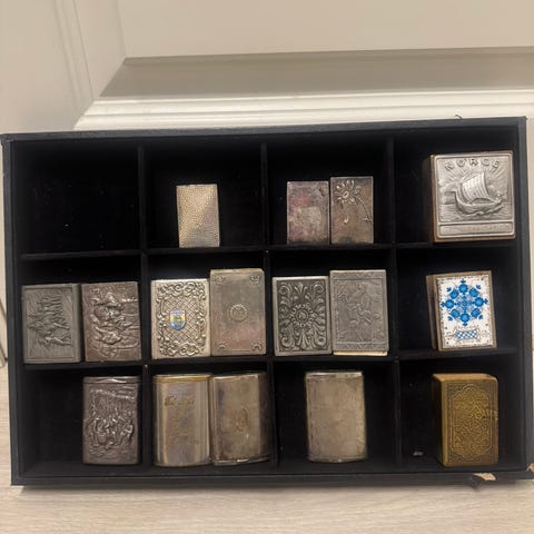 Viktoriansk vintage-eske (1900-1940). Viktoriansk vintage-eske, praktfull, forgylt inni. Laget rundt 1900-1940. Dypt relieffstempel. Det er et produsentstempel. Ifølge data fra Internett: dette kan være en snusboks eller et leppestiftetui, som er laget av sølv. Det er ikke noe stempel på esken. Jeg kan sende pakken i posten.