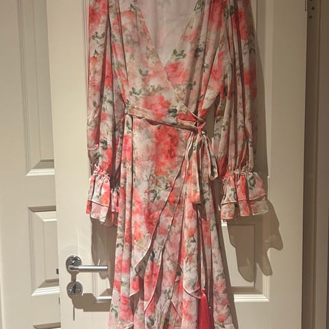 Lys blå Lang omslagskjole fra Haust Collection. Vakker omslagskrage med V-hals og volanger. Perfekt for sommerfester eller bryllup. Kvalitet: 90% Tencel 10% Nylon. Fôr: 100% Polyester. Finvask 30 grader. Ny pris 2999. Helt ny ikke brukt.