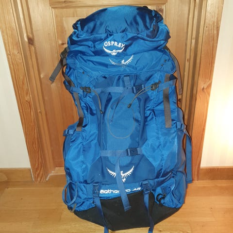 Osprey Aether 65 ryggsekk i blå farge. Denne ryggsekken har en kapasitet på 65 liter, ideell for lengre turer og ekspedisjoner. Den er utstyrt med justerbare skulderstropper og hoftebelte for optimal komfort. Materialet er slitesterkt og designet for å tåle tøffe forhold. Ryggsekken har flere lommer for organisering og enkel tilgang til utstyr.
