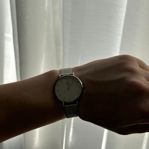 Daniel Wellington Classic Petite klokke for dame med grå meshrem. Klokken har en minimalistisk svart urskive og er laget av rustfritt stål. Passer til både hverdag og formelle anledninger.