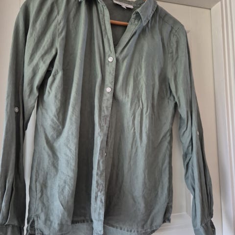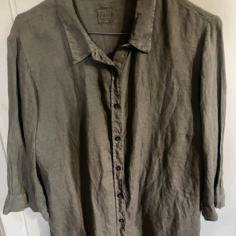 En nærmest grågrønn linskjorte. One size men heller en romslig 46 etter min mening. Oppbrettbare ermer ca 3/4 lengde. Fasongen er slik at den er videre nederst, altså ikke en rett skjorte og lengre bak enn foran. Vasket for å se om den kunne krympe nok til meg men det hjalp ikke stort. Ikke merke men står at den er sydd i Italia.