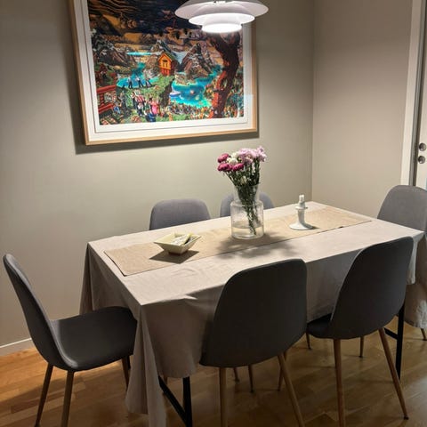 • Farger: Bord (mørk plate), stoler (brunt trekk/hvite ben), sofa (grå), TV-bord (hvitt)