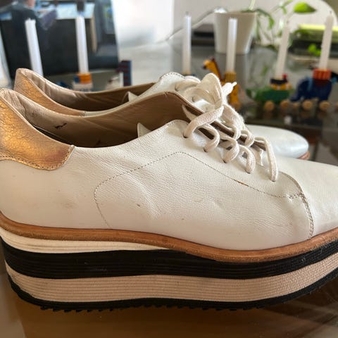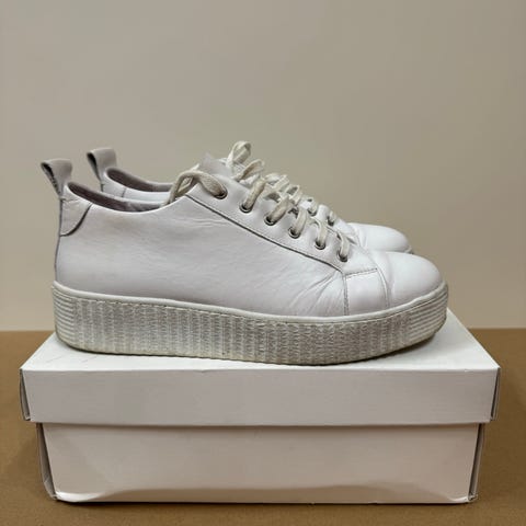 Hvit sko i størrelse 41 (egentlig amerikansk str. 10, som skal tilsvare EU-størrelse 41). Bare brukt noen få ganger og selges fordi de er for store. Skoen har en tykk såle for ekstra høyde og komfort (ca. 5 cm bak og ca. 4 cm foran) . Den er laget i et materiale som gir et stilrent utseende. Passer til ulike anledninger og kan kombineres med flere antrekk.