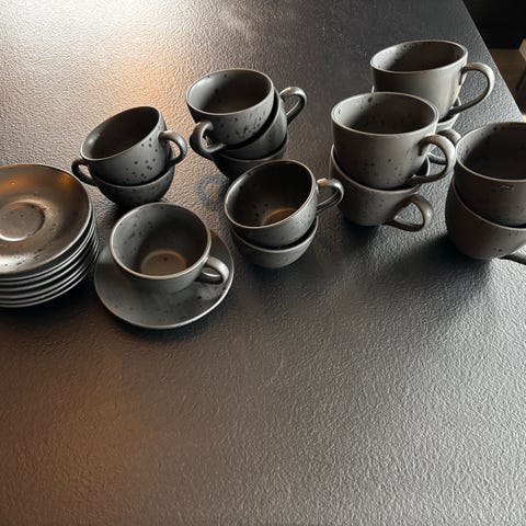 Settet består av 6 kopper og 6 skåler (totalt 12 deler). Brukt lite, i god stand uten skår.