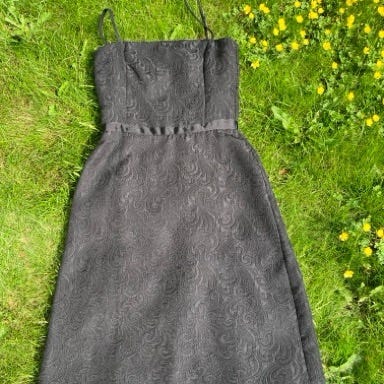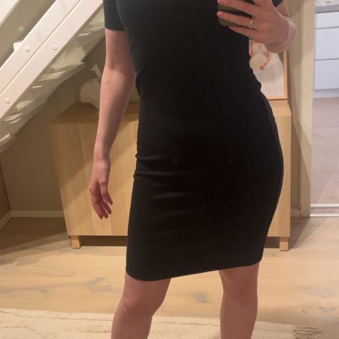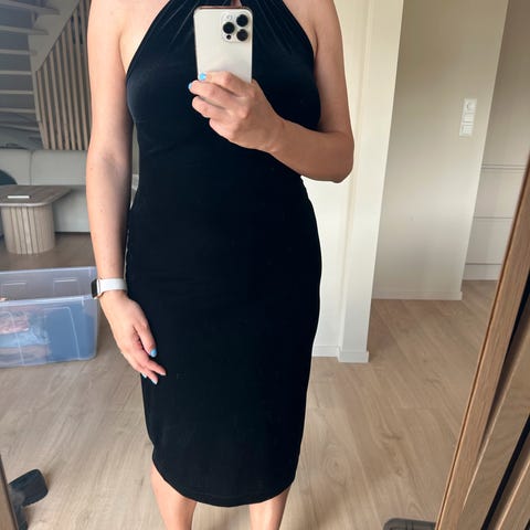 Liten svart coctailkjole med fin ringdetalj foran som gir det lille ekstra. Den er dessverre for stor for meg.
