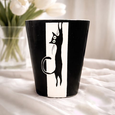 Vaffelmønstret kjøkkenhåndkle med morsom svart katt som jakter på en gullfisk i akvariet.