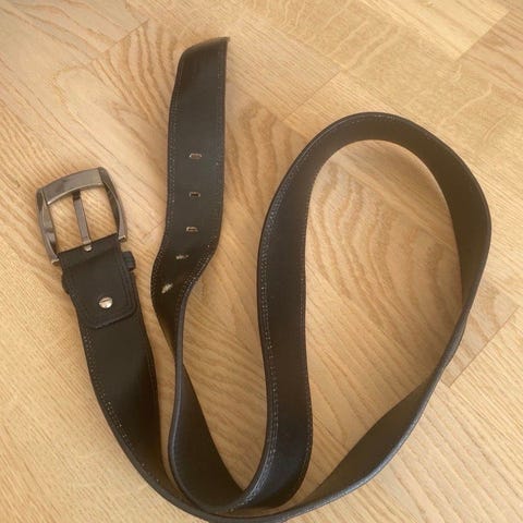 Pent brukt belte ca 91 cm langt og 3 cm bredt (det innerste hullet er mer brukt og litt utvidet). Sannsynligvis imitert lær/skinn. Hentes eller sendes mot frakt.