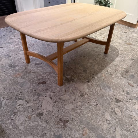 Pent brukt sofabord i heltre eik. Solid og «tungt» bord. Ingen synlige riper eller skader. Kvadratisk bord, glassplatene kan tas ut ved ved behov. Hylle for oppbevaring under.