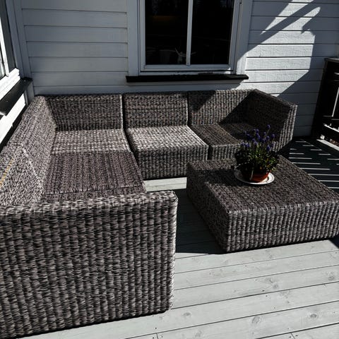 Hagesofa i grått stoff med tre sitteplasser. Rammen er laget av solid materiale, egnet for utendørs bruk. Sofaen har avtakbare puter for enkel rengjøring og vedlikehold. Perfekt for terrasser eller hager. Kjøpt på Hageland 20.04.2020.