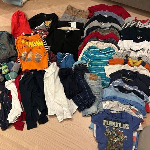Pent brukte klær str 98/104 i hovedsak fra Next, men og litt diverse. Metallica, AC/DC og Nirvana band tskjorter. Ett lite hull i Metallica t-skjorte, se bilde. Alt kjløpt nytt av oss. Dyr- og røykefritt hjem.