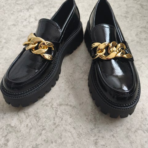 H&M pensko i størrelse 38. Disse skoene er i svart farge og har en stilren design med dekorativ lenkedetalj. Perfekte for formelle anledninger eller som en elegant tillegg til hverdagsantrekket.