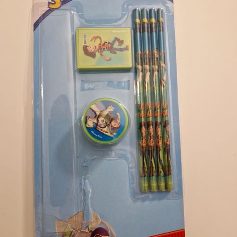Disney Cars skrivesett for barn inkluderer en notatblokk med 35 ark, en blyant med viskelær, en blyantspisser og et viskelær.