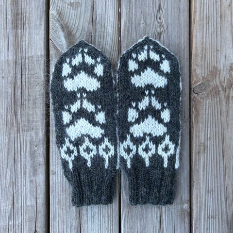 Helt nye hjemmestrikkede villmarksvotter i rosa/lilla og hvit. strikket i det islandske garnet lettlopi som gjør at vottene blir veldig lett, luftig og samtidig varme. Garnet består av både underull og dekkhår fra sauen som gjør at plagget blir vannavvisende og veldig slitesterkt. Plagg strikket i lettlopi egner seg derfor utmerket til bruk i vær og vind. Passer godt til friluftsliv men også til hverdags. Garnet føles litt grovt ut men blir mykere i bruk.