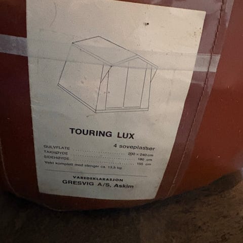 Gammelt militær telt med vedfyrt ovn. Var sist oppslått i 2020. Lekker gjennom duk så må impregneries. Må hentes