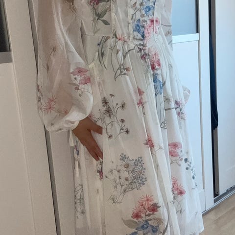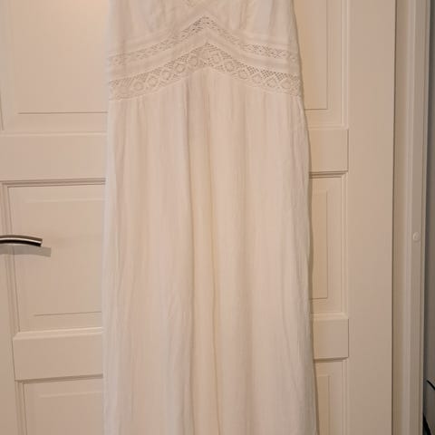 En fin, hvit, lang sommerkjole med nydelig detaljer ved bryst partiet. Kan reguleres og den er foret med underkjole.