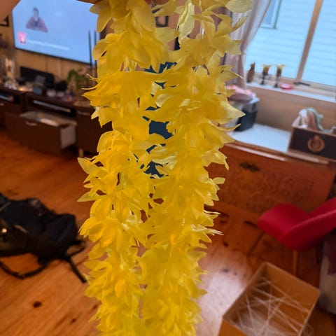 Hawaiikrans og hårspenner i gult. Ubrukt, uåpnet og med lapp og prislapp på begge deler.