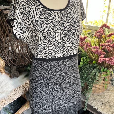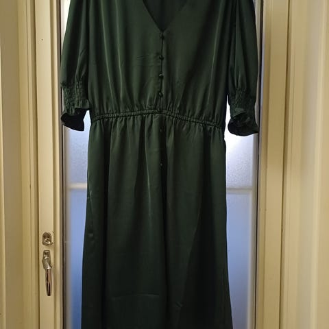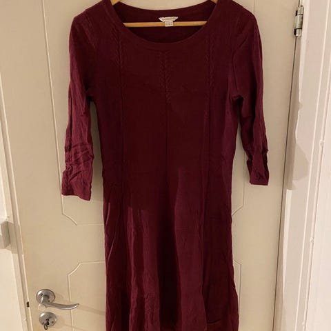 Veldig fin flettestrikket kjole fra Indiska. Mønsteret og fargen kommer best fram på nærbildene. Rund hals, lange ermer. Ullblanding, perfekt vinterkjole. Den har blitt brukt en del, men ser ingen bruksmerker på den. Knelang til meg (174 cm). Veldig elastisk og former seg pent etter kroppen.