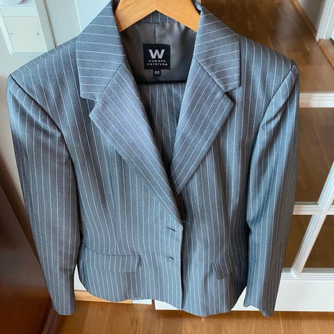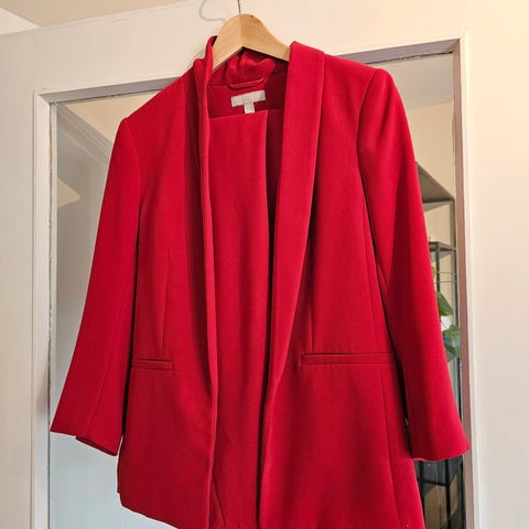 Jakke og skjørt i rødt med sorte knapper og sort bukse til