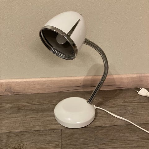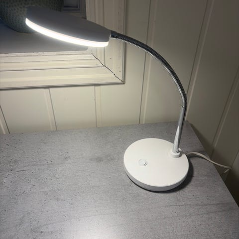 IKEA bordlampe i hvit farge. Lampen er utstyrt med en fleksibel arm for enkel justering av lysretningen. Designet for bruk på skrivebord eller nattbord, og passer godt inn i moderne interiør. Lampen leveres med en strømadapter.