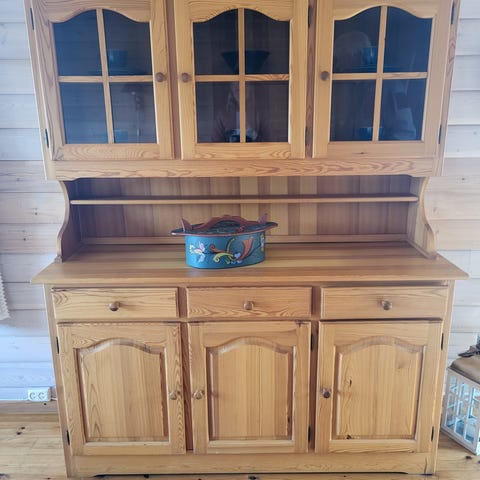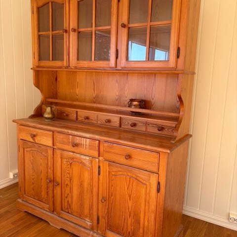 Vakkert vintage tre skap med glassfronter, flere skuffer og hyller. Perfekt for oppbevaring og utstilling. God stand, flott for hjem eller hytte. Må hentes inne 29 mars