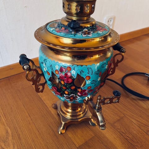 Fin dekorativ Russisk samovar. Elektrisk med egen separat ledning. Ser veldig fin ut og er komplett. 33 cm høy.