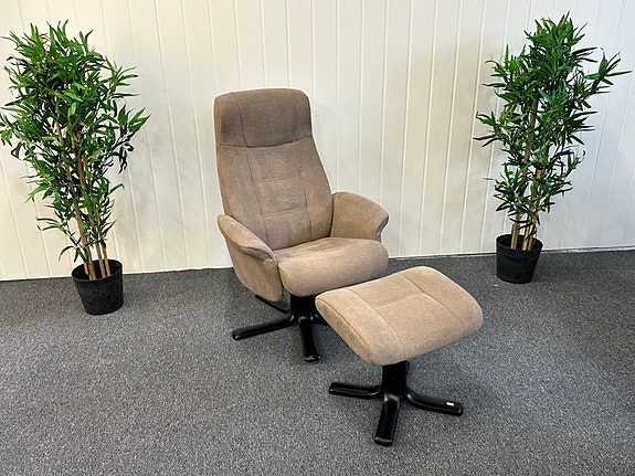 Lenestol/ hvilestol med fotskammel og justerbar sittestilling, fra oppreist til liggende (og alt i mellom).