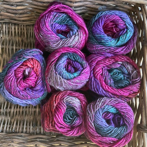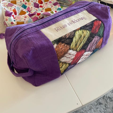 Prosjektpose/ strikkepose. Foret med vlieselin og bomullsstoff/avstivet. O-ring. Hempe. Glidelåslukning. 34x27