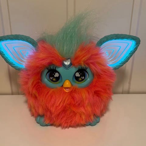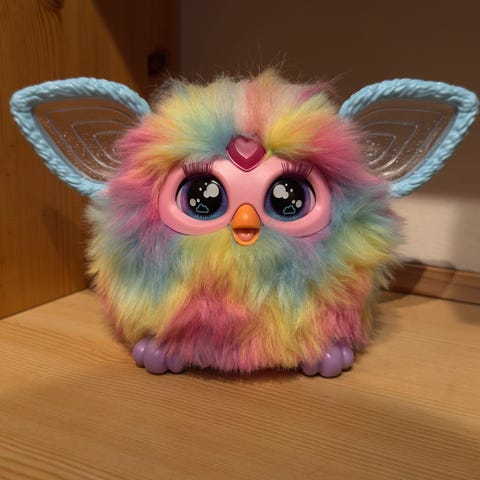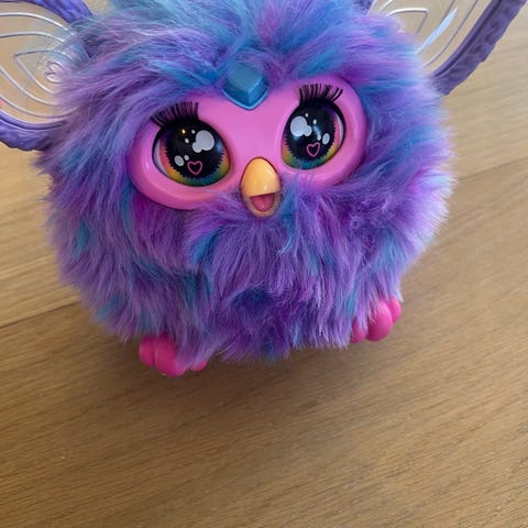 Furby Hoots interaktiv leke i hvit og blå. Denne leken har store uttrykksfulle øyne og kommer med en blå base. Perfekt for barn som liker interaktive og engasjerende leker.