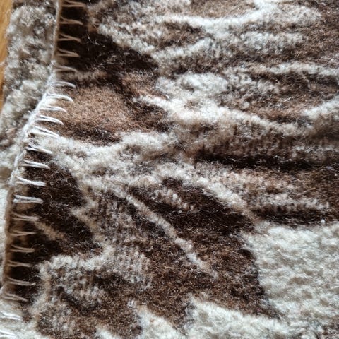Denne er stor, varm og har hestemotiv på begge sider. Den er kremfarget på den ene siden og brun på den andre siden. Denne kan brukes på begge sider.