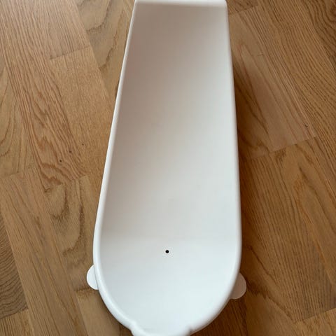 Nyfødt støtte til bruk i badekar, med sugekopper på undersiden og som er justerbar i skrittet slik at den vokser med barnet.