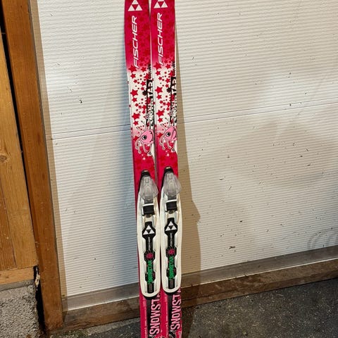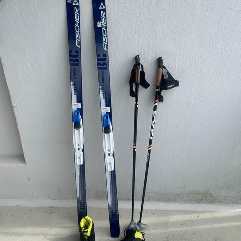 Fischer langrennsski med tilhørende staver og sko. Skiene har bindingssystem og er egnet for langrenn. Stavene er tilpasset for bruk sammen med skiene. Skoene er designet for langrenn og passer til bindingene på skiene.