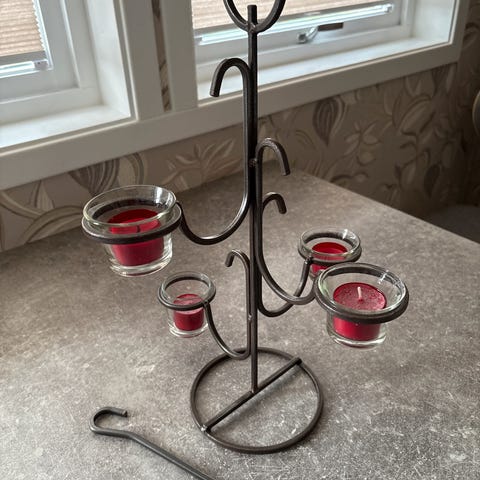 Moderne grå og smijernsstake m/ 4 grå glasskolber til Telys - meget dekorativ og uten bruksmerker - solid