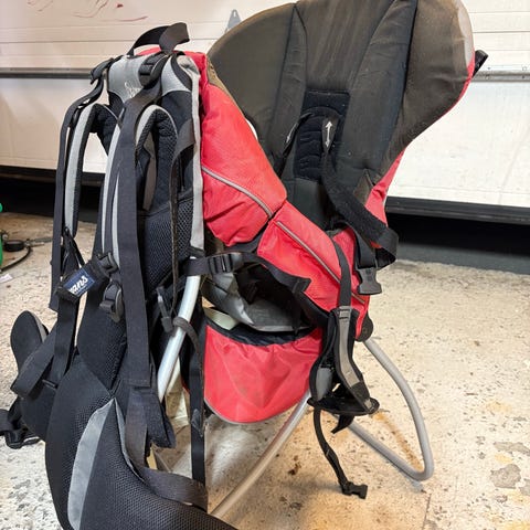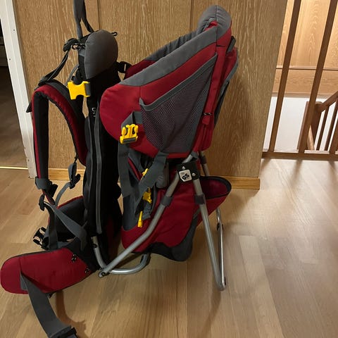 Fin og god bæremeis, phil&teds escape. Lite brukt. Ingen slitasje, har også tak og bleiebytteunderlag baki sekken. Avtakbar liten og praktisk sekk bakpå. Fotstøtter til barnet, regulerbar lengde. Veldig god støtte til barnet med fleire seler og klips. Det einaste som mangler er eine sida av brystklipsen for den voksne (sjå bilete). Må hentast på Landås.