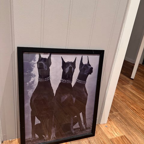 Pent hunde bilde med glass og gullfarget ramme. Ca 32 cm x 26 cm