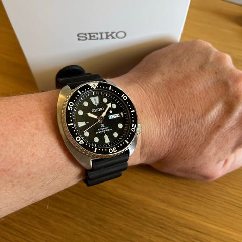 Ikonisk turtle case med pepsi bezel og svart dial. Vanntett til 200m.