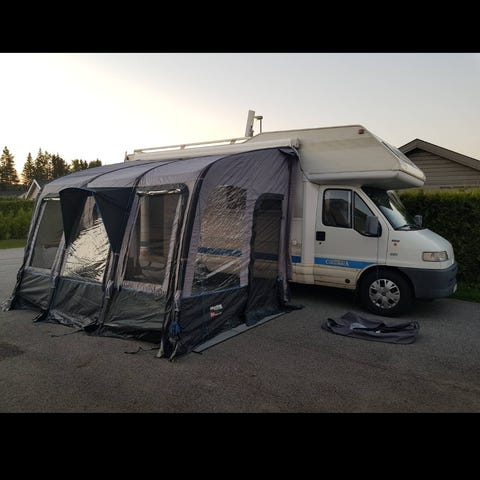Oppblåsbart telt. Teltet er brukt kun 1 uke i sommer. Selger fordi jeg har fast plass til campingvogn og skal derfor ha et helårstelt. Ny pris var kr 12 141,-.