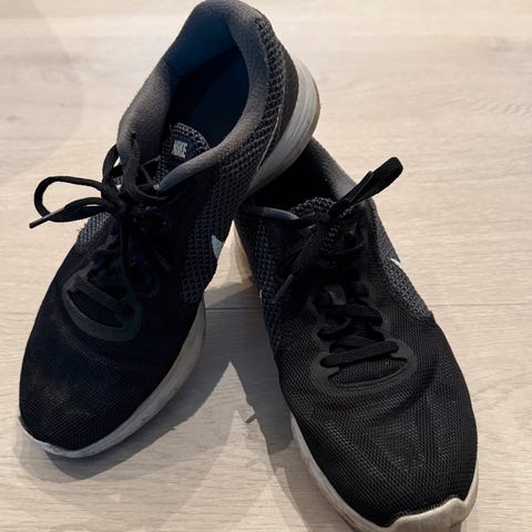 Nike sneakers i størrelse 38,5 Disse joggeskoene er laget for kvinner og kommer i en nøytral farge. Perfekt for hverdagsbruk eller trening. Laget av slitesterke materialer for komfort og støtte. Hvit såle. De er pent brukt av jente 12 år.