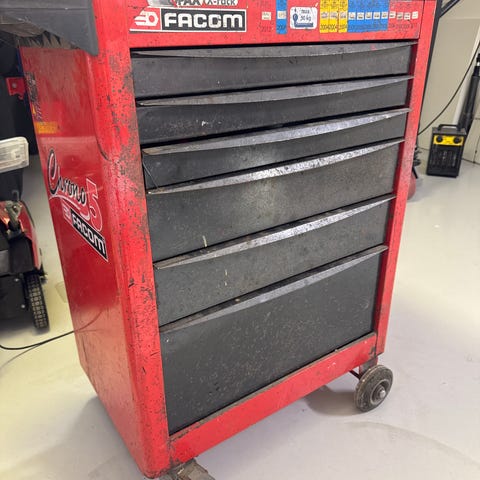 Facom verktøyvogn i rød og svart. Laget av slitesterkt stål. Vognen har flere skuffer og inneholder et bredt utvalg av verktøy, inkludert skralle, skiftenøkler og skrutrekkere. Egnet for verksted eller garasje. Montert på hjul for enkel mobilitet.