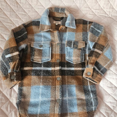 Veldig kul og deilig jakke i et fluffy teddy ytterstoff og tynt innerstoff. Laget av polyester. God og varm. Romslig, rett modell og passer fra 140 /10 år. Brukt kun få ganger og kun en sesong.