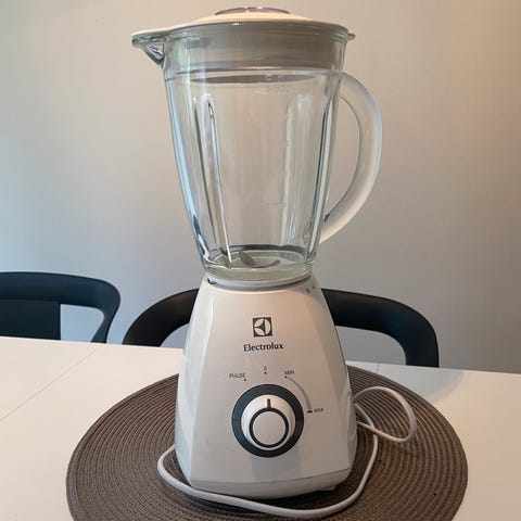 Krups Power XL6 Blender i hvit plast. Denne blenderen er utstyrt med en kraftig motor og en holdbar glassbeholder. Den har flere hastighetsinnstillinger for ulike typer blandinger. Funker helt godt