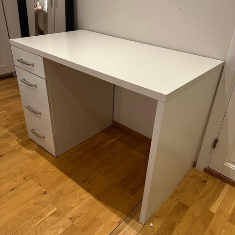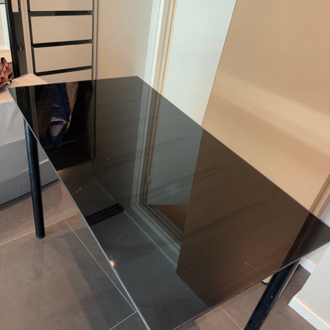 ett pent brukt skrivebord fra IKEA. Det er ett stort og solid bord med svart farget glass. Noen små bruksmerker er det så klart. Det er mulig å justere høyden på bena og det følger med en beskyttende matte i lær.