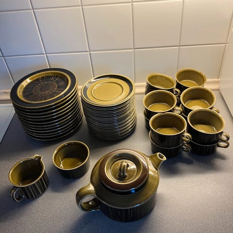 Egersund Lido tallerken i gul farge. Perfekt for samlere av vintage servise. Se mine andre annonser for matchende servisedeler. 12 tallerkner, selges samlet for 800kr.