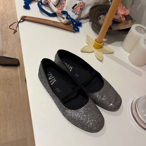 Zara Ballerinasko i størrelse 37. Skoene er svarte og har en klassisk design med sløyfedetaljer. De er laget for å gi komfort med en elegant stil, egnet for daglig bruk eller spesielle anledninger.