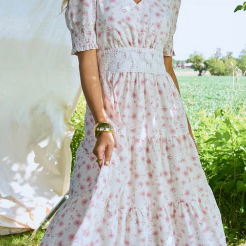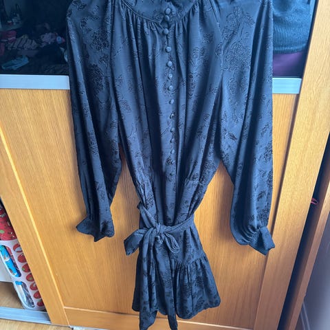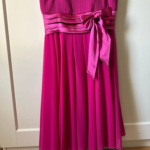 Nydelig kjole når du skal være fin til fest eller bryllup. Eller du kan dresse den ned ved å bruke andre type sko. Grunnfargen er lyse rosa. Brukt 1 gang, ingen skader eller flekker. Størrelsen er 36, men jeg bruker størrelse 38 til vanlig, så den er stor i størrelsen. Kjøpt på Olivia’s.