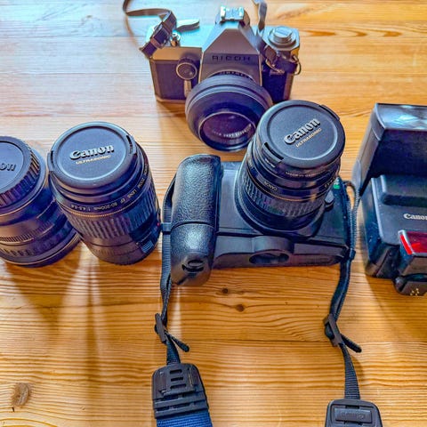 Meopta Axomat 5 fargeforstørrelsesapparat med tilbehør. Settet inkluderer Anaret S 4.5/50 objektiv, forstørrelsesramme for papir opptil 10x12 tommer, og diverse kjemikaliebeholdere. Ideell for mørkeromsarbeid og fotoforsterkning.